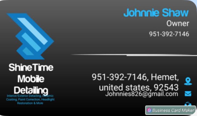 Shine Time Mobile Detailing Contact Johnnie Shaw 951-392-7146 for interior details, paint corrections, headlight restoration, water spot removal, engine bay detailing and more. Hemet 4WD members get 40% off. welcome back Johnnie!
